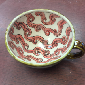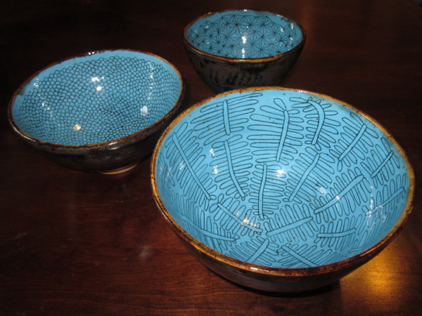 Much of it involves patterning in the greenware stage: I etch a drawing into wax resist with a needle tool and fill with underglaze, producing an appearance similar to drawing in pen.